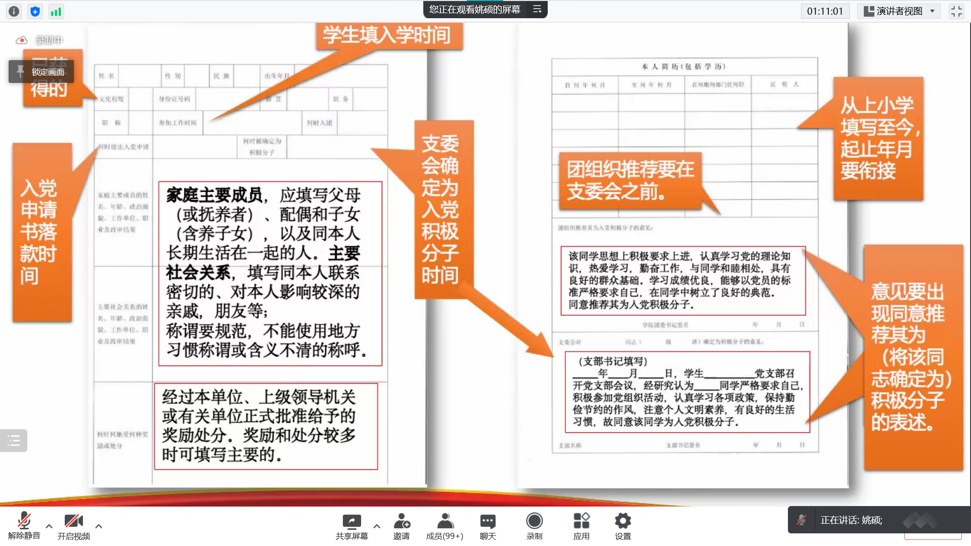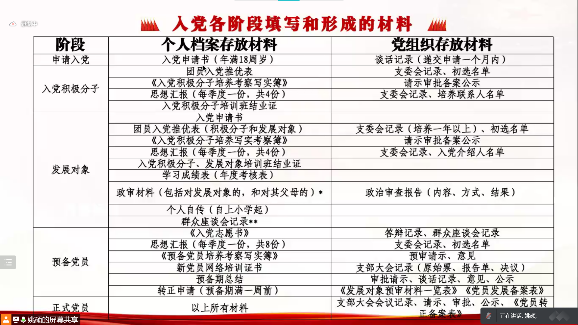 姚硕向同学们介绍了党员发展工作流程及注意事项,她希望各员工党支部委员严格执行党员发展工作流程,注意材料填写细节,并强调入党积极分子、发展对象要端正态度,认真学习,严格遵守党员发展流程。