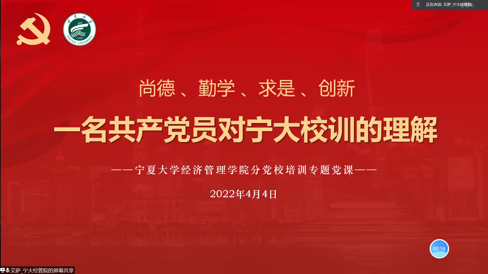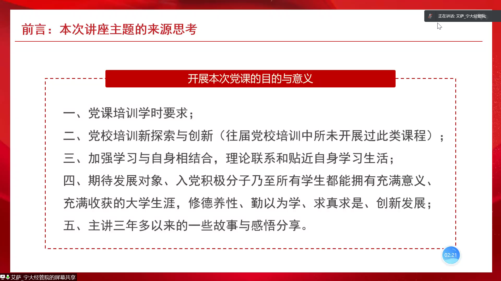 艾萨从五个方面介绍了本次党课的目的及意义。一是党课培训学时要求;二是党校培训新探索与创新;三是加强学习与自身相结合,理论联系和贴近自身学习生活;四是期待发展对象和入党积极分子乃至所有员工都能拥有充满意义与收获的老员工涯,修德养性、勤以为学、求真求是、创新发展;五是分享自己三年多以来的一些故事与感悟。