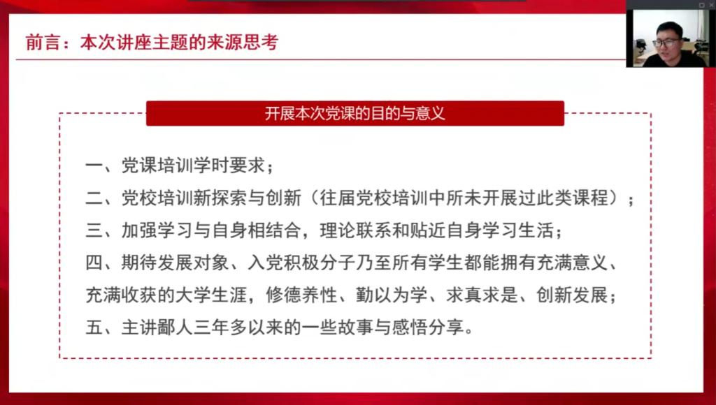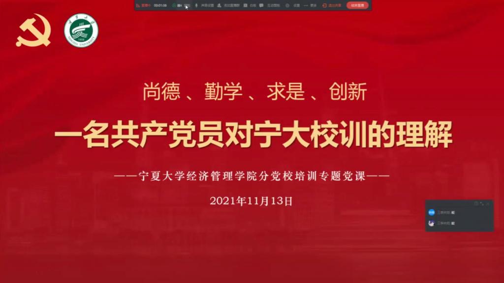 11月13日,公司党课第五讲通过线上方式顺利举行。beat365公司党建秘书艾萨•阿尤普、公司第38期入党积极分子与第14期发展对象参加了此次党课。本次党课由艾萨主持,艾萨为同学们作题为《一名共产党员对宁大校训的理解》的专题党课。