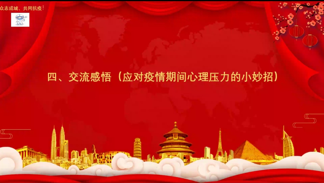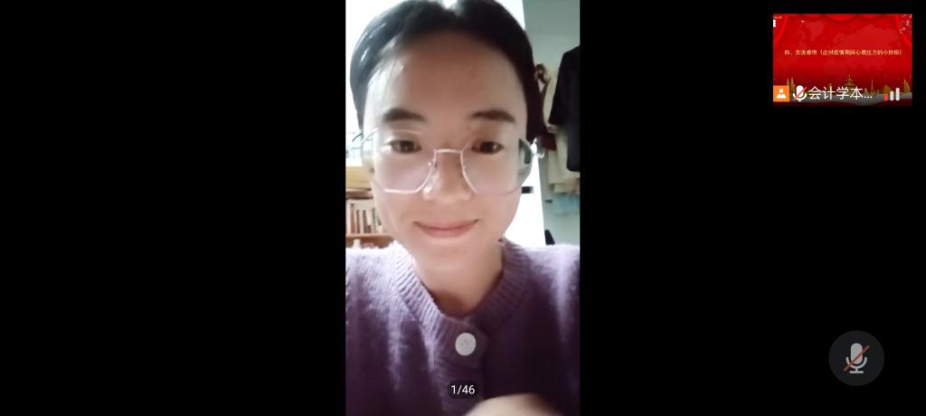 随后会计学本科生党支部与预科公司的志愿者们就如何应对压力进行了经验交流。会计学本科生党支部志愿者管雯表明要合理安排作息时间,面对负面情绪时要适度转移注意力,适当做运动,必要时可进行心理辅导,也希望大家能够调整心态,积极配合相关工作。会计学本科生党支部志愿者杨飞建议做一些容易达成的事情,如听歌等,静下心来调整心态,理解工作人员。预科公司志愿者穆奋梅建议同学们明确压力的来源,做适当的楼间运动,室友之间可以相互按摩,促进情感交流。会计学本科生党支部志愿者李娜表示,要适当运动,可以通过聊天倾诉,保持开心快乐。预科公司志愿者黑花表示要劳逸结合,适当自我宣泄,同时可以让旁人疏导,进行情绪转移。预科公司志愿者罗佳蓉表示这次疫情记忆最深的是郭利老师给隔离的员工们进行了线上交流以此来疏导大家的心理,教导大家调节负面情绪。郭利老师和原博老师又同隔离员工讨论了日常生活问题,使同学们能够安心的在宿舍上课。我们相信前路光明,阴霾终将散去,我们定同舟共济,风雨共度。志愿抗疫,使命必达。最后给同学们一点小建议,在被封的日子里,大家可以和舍友看看电影,唱唱歌来缓解一下心理压力。预科志愿者玛依热代表新疆同学发言,她表示能够参与此次志愿工作,感到十分自豪,也感受到了同学之间的团结、温暖与友爱。她在这次志愿活动中通过奉献实现了自我价值,提高了个人能力,扩展了社交圈,同时表示可以通过唱歌、打游戏来缓解压力。