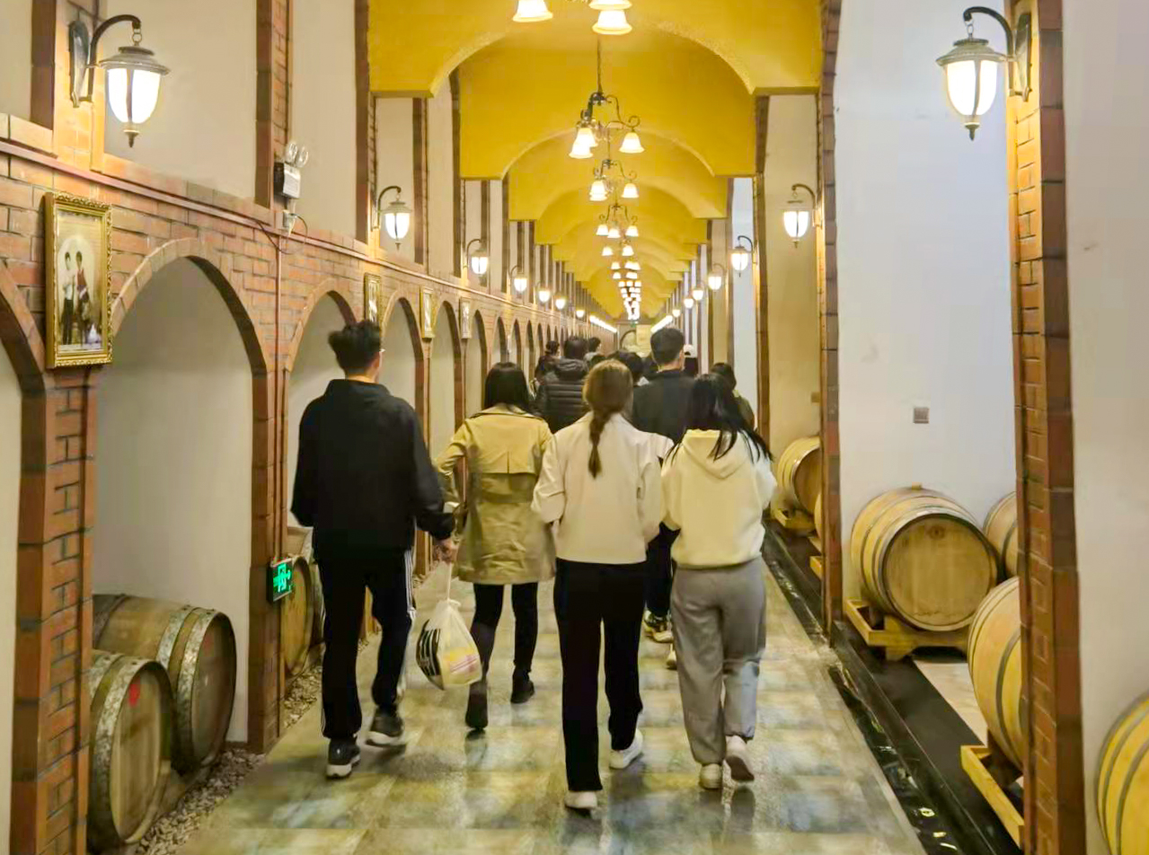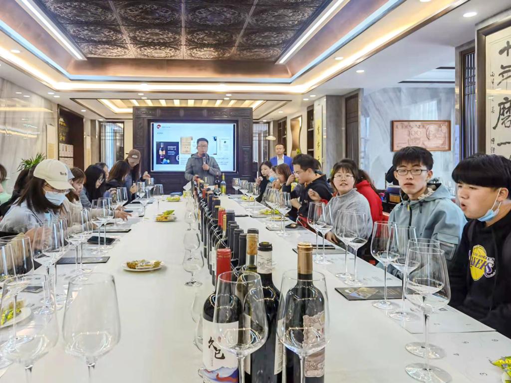 汇天地珍酿,达九州琼浆。宋培带领同学们参观酒庄酒窖,详细讲解了从葡萄种植、采摘、穗选、除梗、粒选、破皮入罐、低温发酵、微氧接触、去处皮渣、橡木桶陈酿、冷冻过滤、无菌罐装到包装入库的葡萄酒酿造工艺。酒庄座谈会中,张振旭介绍了宁夏汇达酒庄所获得的成就,体现了宁夏本土葡萄酒产业的勃勃生机,并带领同学们以握杯、看色、嗅味、入口四步品鉴葡萄酒。同学们对酒庄营业模式与如何打响本土品牌产生了浓厚兴趣,积极向张振旭询问酒庄销售渠道、消费群体细分、解决酒庄同质化以及酒庄未来发展方向等问题,张振旭逐个详细解答。他表示,国民对葡萄酒的认知仍存在很大的局限性,所以其销售路径依旧以传统线下代理商、营销商销售为主,以线上电商销售为辅,对于未来新型红酒的研发,酒庄会做好市场调研,勇于尝试,努力抓住年轻人这一最具潜力的消费群体。