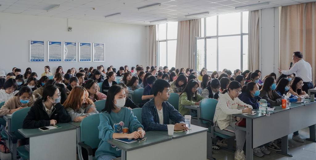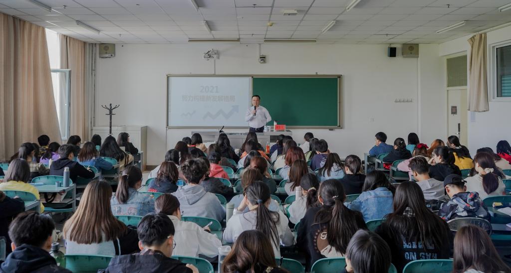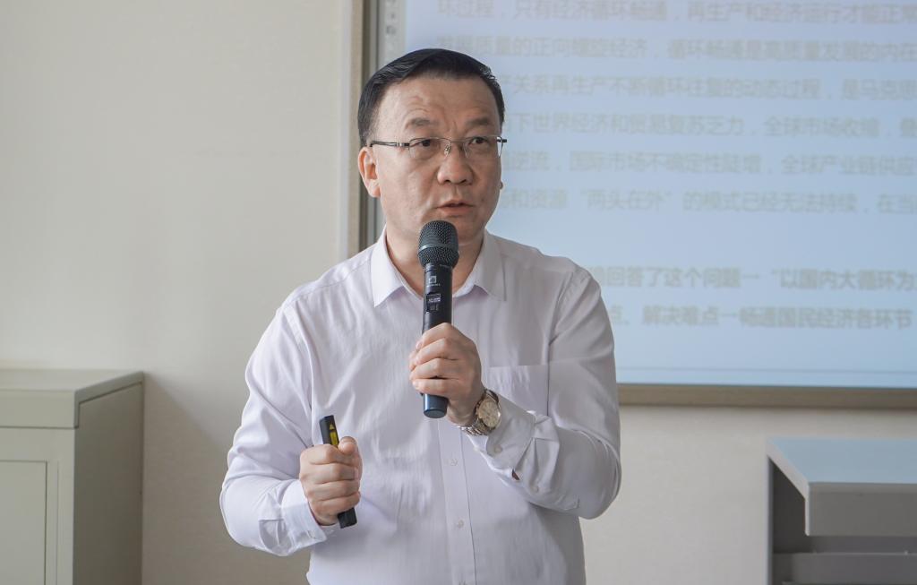 在全场热烈的掌声中,田生宇开始了本次授课。他从“新发展格局”的理论创新、“新发展格局”的题中之义、“新发展格局”的应有之举三个层面为大家系统、详细介绍了构建新发展格局的意义与具体措施。他引经据典,联系实际案例,用精准的数据为大家做了详尽的讲解,引起全场热烈的掌声。