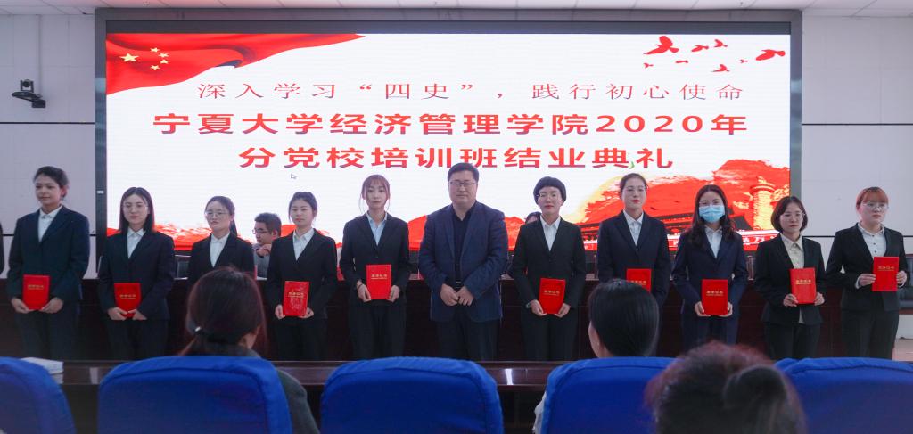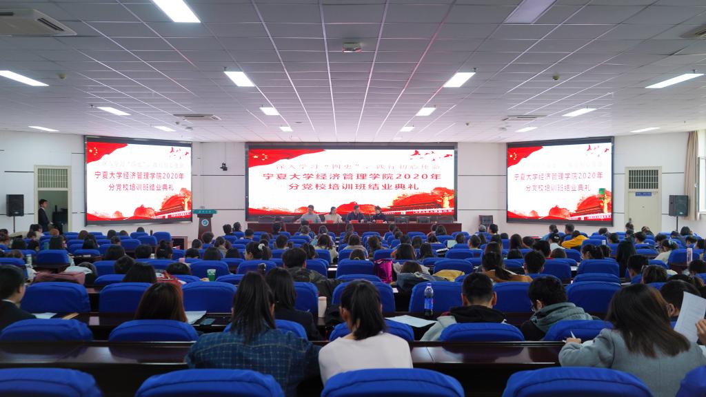 11月13日中午,beat365在线官网入口于贺兰山校区文荟楼东报告厅举行了分党校2020年秋季班党课结业典礼。公司党委副书记程胜利、经济学本科生党支部书记何韶华、工商管理本科生党支部书记姚硕、会计学本科生党支部书记孙文元以及十一期、第十二期发展对象和第三十五期、三十六期入党积极分子到场参加。