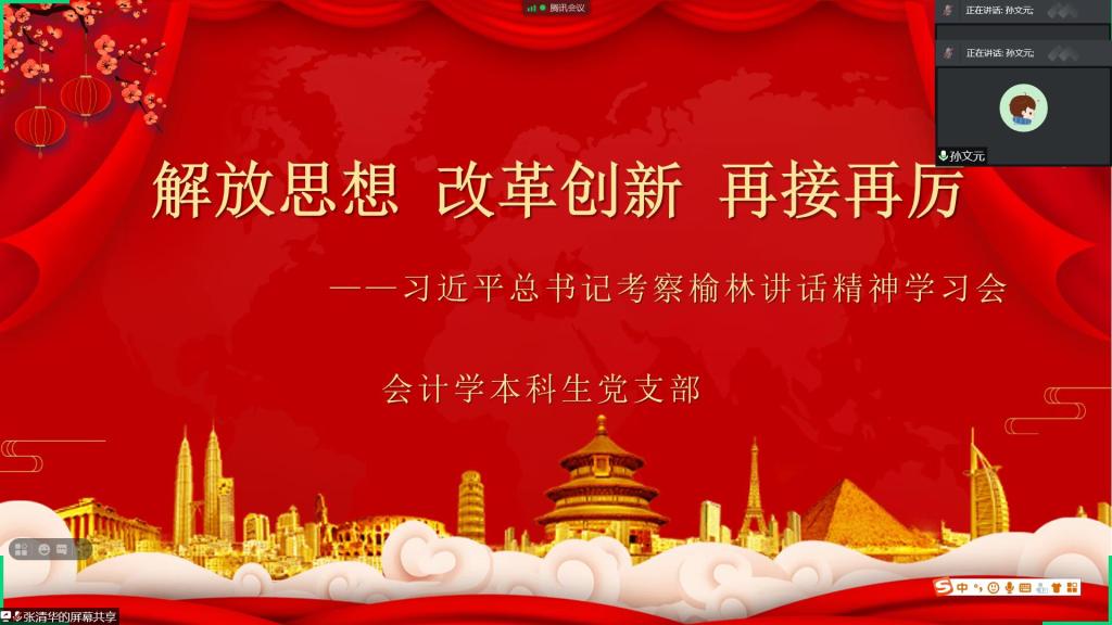 为认真学习贯彻习近平总书记在陕西榆林考察期间重要讲话精神,beat365在线官网入口会计学本科生党支部于10月27日晚在线上组织全体支部党员开展了“解放思想、改革创新、再接再厉”主题党日活动。会计学本科生党支部书记孙文元、会计学本科生党支部全体党员参加了本次学习,会议由张清华主持。