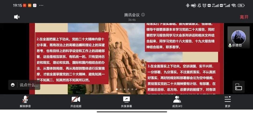 党员代表张澳群表示作为新时代的员工党员,我们要守纪律、讲规矩,自觉做政治上的“明白人”,不放松理论学习,不放松自身修养和素质的提升,不放松工作生活中的小节问题,自觉加强学习,筑牢理想信念;张淼同志通过学习认识到作风建设永远在路上,作为党员应当严于律己,行为要清正,切实增强自律观念,自觉抵制不良风气的侵蚀,高标准严要求,主动接受各位党员同志的监督;朱东升同志表示从反对形式主义和官僚主义来看,应当重点关注以下两个方面:一是要紧盯形式主义、官僚主义新动向新表现,充分认识形式主义、官僚主义的多样性和变异性,摸清其在不同时期、不同地区、不同部门的不同表现;二是要拿出真招实招,切实加强监督管理,抓出实效。
