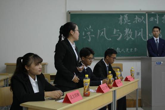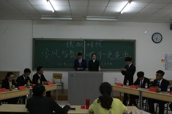 本次模拟辩论赛分为五项环节。首先由正方一辩论述正方观点,他认为学风比教风更重要,并从三个方面对自己的观点进行了阐述,论证有条有理,论点强劲有力,而反方一辩也不甘示弱,也从三个方面提出了相反的观点,认为教风比学风更重要,陈词尽显锋锐。其次进行一对一公辩,由双方二三辩提出对方见解的不足,并解释己方观点,每人有半分钟的论述时间。随着比赛的进行,空气中的“火药味”越来越重,比赛也到了关键性时期——自由辩论环节,辩手们不愧为多场比赛中脱颖而出的佼佼者,相互的反驳令观众啧啧称叹,大家的掌声更是连绵不断。高潮过后,由双方一辩进行立论总结,指出对方在辩论中的不足论点与论据,并论述己方的论点。到了比赛的最后阶段,双方四辩用高度概括性的总结陈词为本场比赛画上了圆满的句号。最后由评委老师对参赛选手进行评价,指出了两方的不足与优点,并希望参赛选手在正式辩论赛上能够沉着应对,让自己的论据清晰确凿有条不紊,争取得到一个好名次,为经管公司赢得荣誉。