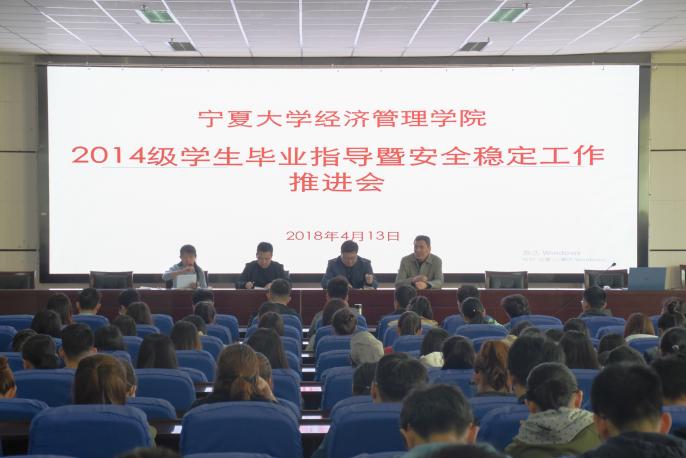 4月13日上午,beat365在线官网入口于beat365贺兰山校区文荟楼东报告厅举行“2014级员工毕业指导暨安全稳定工作推进会”,公司党委副书记程胜利、员工工作办公室主任黄旭兴、新疆员工工作坊内派教师阿曼台、2014级辅导员何韶华出席会议。2014级全体在校生到场参加。