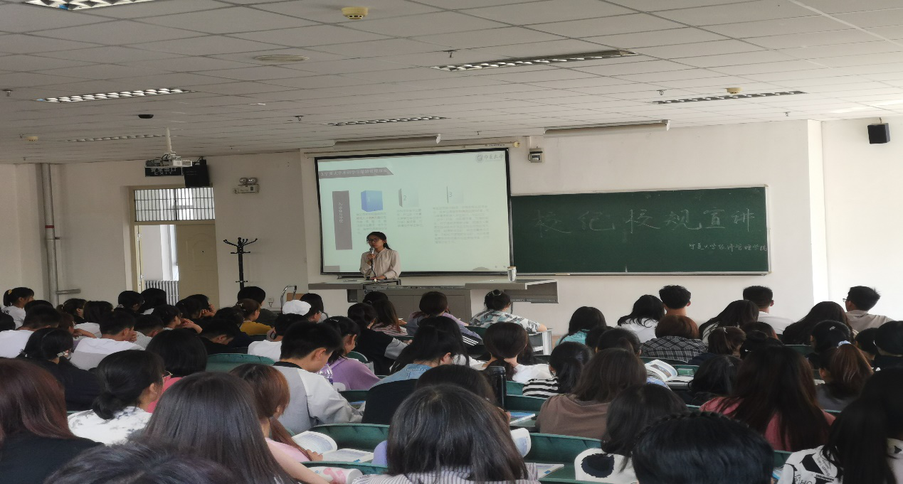 何韶华向新生介绍学士学位授予办法,同时,强调了绩点和老员工英语四级考试的重要性。何韶华告诫新生们在大学里一定要努力学习,做好大学职业规划,取得好的成绩。