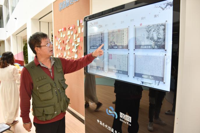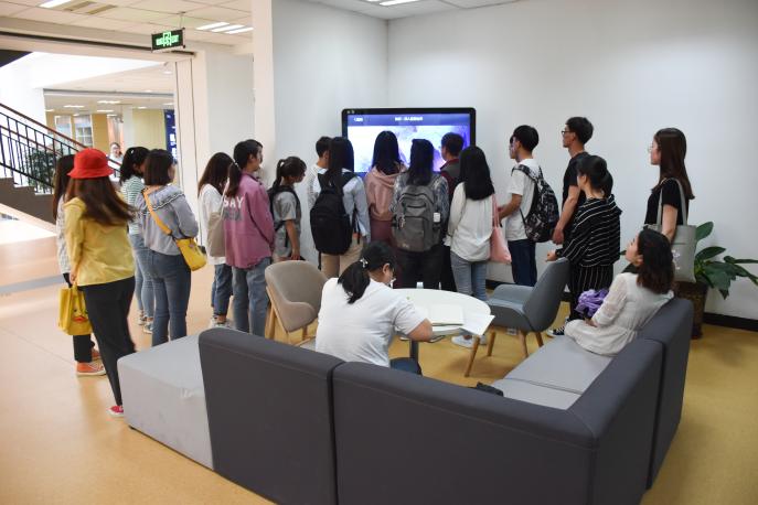 馆内难以计数的棕黄色书架有序地排列在落地窗边,世人瞩目的名著、云淡风轻的散文、富含哲理的中外诗篇整齐地放置在书架上,包围着读者,沉浸书海的感觉油然而生;同学们可以利用图书电子瀑布流,通过微信扫码,将喜爱的图书收藏在手机中免费阅读。此外,馆内的研修间也是一大特色,它为员工提供了一个独立、安静的场所,同学们可以通过线上预约的形式,在这个小空间里准备考研、准备各类创新创业比赛。馆内还设置了中国历代馆藏书画电子艺术馆及全球高清纪录片等数据库资源,用简单直接的方式将图书馆的资源展现在读者面前,同学们通过扫码便可以获取信息,消除了数据鸿沟……