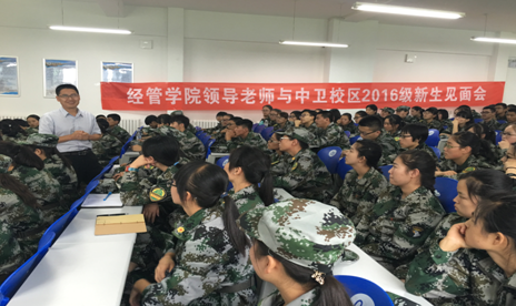 8月25日下午,beat365在线官网入口举行了2016级中卫校区新生与领导、老师见面会。公司党委书记张桓老师、经理杨国涛教授、工商管理系主任杨彩玲老师、市场营销专业负责人王仲梅教授参加了会议。