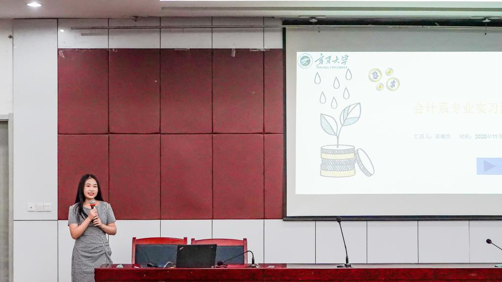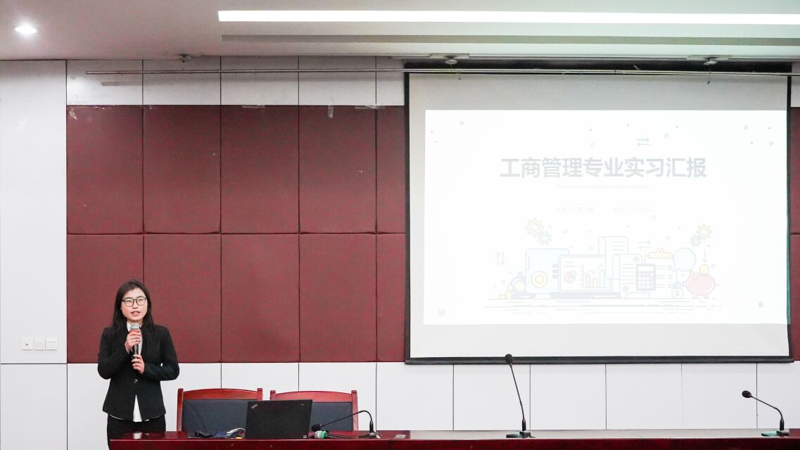 张彩彩宣读《专业实习汇报评奖细则》后,汇报会正式开始。信息管理与信息系统专业员工汇报了在宁夏聆音智能科技有限公司实习的情况,通过实习,同学们更加全面和清晰的认识了企业运营模式、业务流程、项目实施、管理理念、社会责任等方面的具体内容,结合自身专业特点,对标企业要求,本次实习经历为他们日后就业打下良好基础。会计学专业本科生蒋曦然通过结合自己的实习经历分享了会计电算化的创新发展以及复合型财会专业人才的发展方向。工商管理专业本科生杨百慧在汇报中讲到,基于工商管理专业的教学安排,并充分考虑疫情防控工作的相关要求,工商管理专业本学期的专业实习没有安排到企业顶岗进行而是员工以4到5人为一个小组,通过线上或线下调研的方式完成调研报告。实习主题调研围绕工商管理专业课程和研究方向,针对疫情下各类企业在经营管理中遇到的困境、问题,分析其原因并提出解决方案,以此为思路完成实习报告。物流管理专业本科生母小花讲解了本次实习共经历了实操演练、物流方案设计、物流数字化管理学习、立体货架储物学习、现代化信息管理学习、流通加工设备的参观和实习,并以专业素质、行业发展、社会使命感三个方面总结了本次实习收获。农林经济管理专业本科生倪雪作出了汇报,她说明了本次实习的背景和地点,并展示了农产品的高质量发展。倪雪总结到,在本次实习中同学们开拓了视野,树立了专业自信,领略了农业魅力。市场营销专业本科生李金凤在汇报中讲到,市场营销专业同学参加了宁夏数字经济高质量发展论坛,听特色,听发展,在实习过后收获了沉甸甸的营销案例,对于自己的未来也有了更为清晰的规划。电子商务专业员工和经济学专业员工也相继作出了汇报。