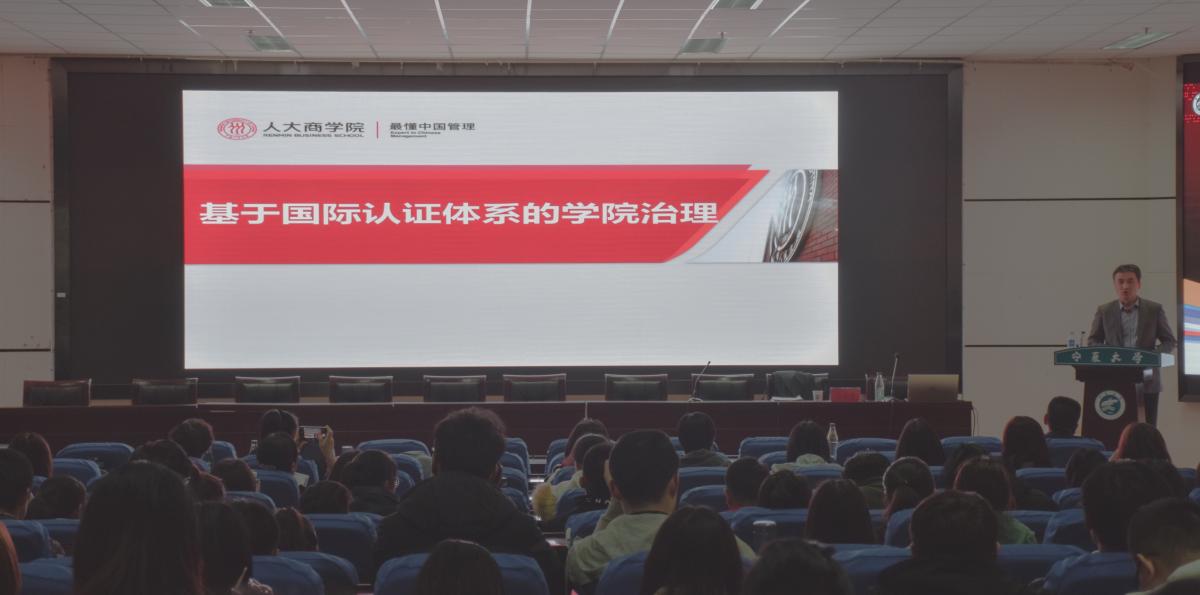 讲座过程中,毛基业从“基于国际认证体系的公司治理”与“商科教育的特征”两部分出发,分别从教师和员工的视角出发阐述了要建设一流院校,他们各自应当负担起怎样的责任。他从AACSB认证体系出发,提出要做好公司治理,首要任务是做好公司的战略管理,尤其应当重视公司使命、公司愿景的树立。其次,毛基业针对公司建设重要参与者——教师提出了一系列要求。他指出作为一名经济公司的老师,必须具有优越的学术资质、专业资质,并且要始终持有实施学习质量保障的目的和态度,积极推动组织变革,创新教学方式、升级教学管理体制,科学有效的培养员工,带领员工一同实现公司使命与愿景。毛基业更深一步指出,教师应从公司使命出发制定培养目标和目标学习成果,并在教学过程中不断吸纳相关中西优秀文化、不断改善培养计划,从而形成AOL闭环,持续推进公司教学质量改进,在场教师受益颇深。