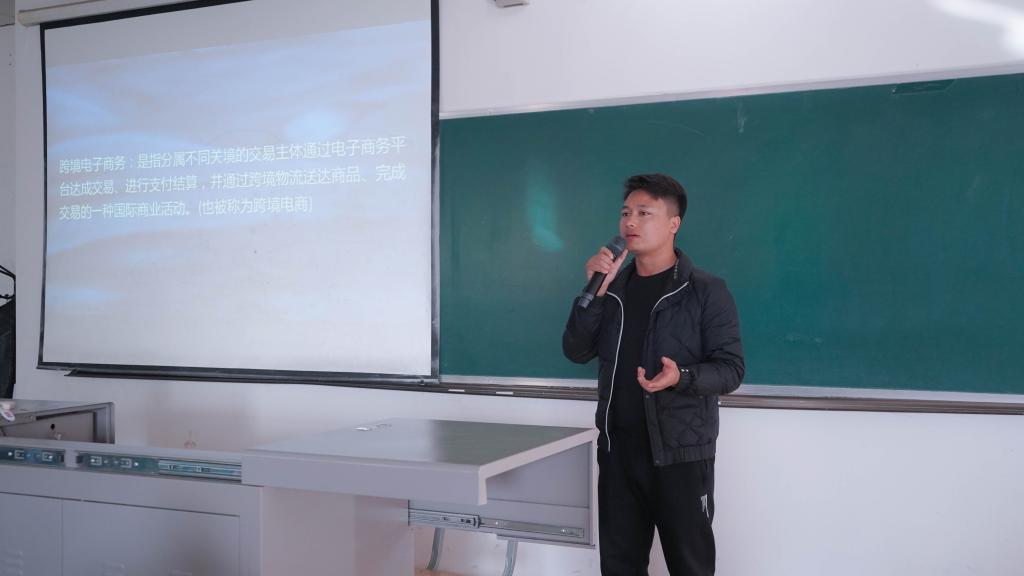 艾萨对杨万龙与伏芳伟表示了热烈的欢迎后,讲座在群情振奋中拉开了帷幕。杨万龙借用一张简洁的流程图为同学们讲明了跨境电商的运营流程以及跨境电商的现状与未来的发展前景,当下跨境电商市场面临制度不规范、人才稀缺等方面的挑战,但国家政策对跨境电商的大力支持,使跨境电商的发展呈现稳步上升的趋势。杨万龙从个人、国家和全球经济方面解释了自己从事跨境电商行业的初心并在提问环节详细解答了同学们的疑惑。