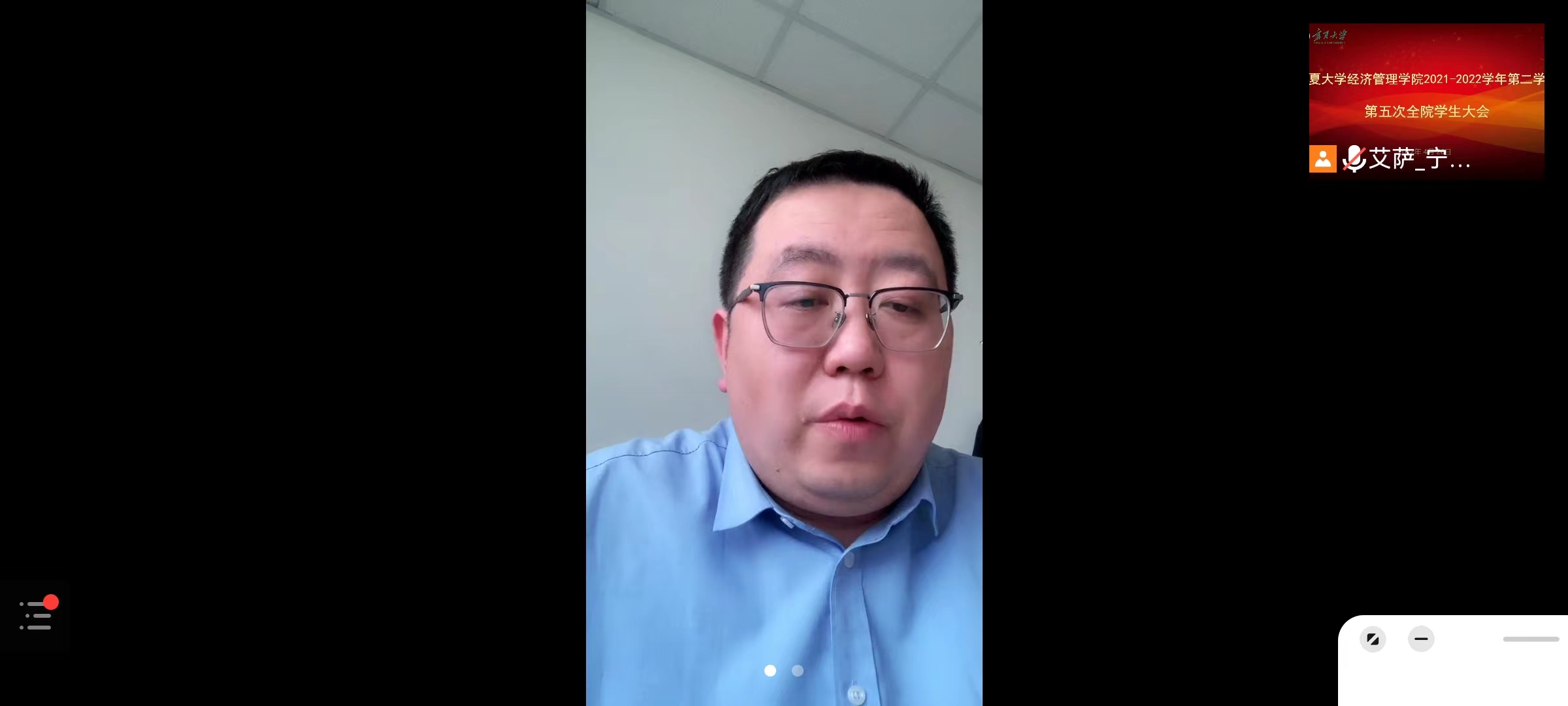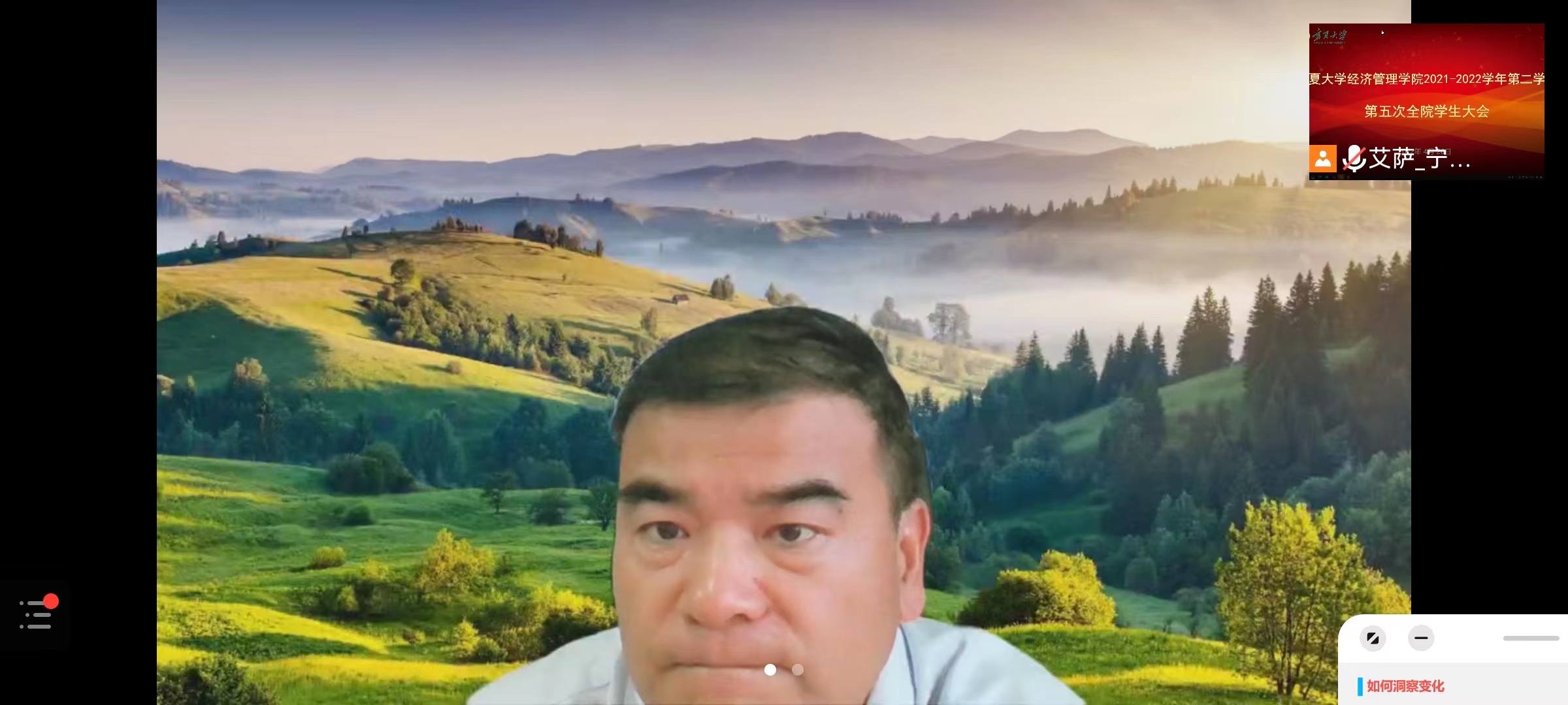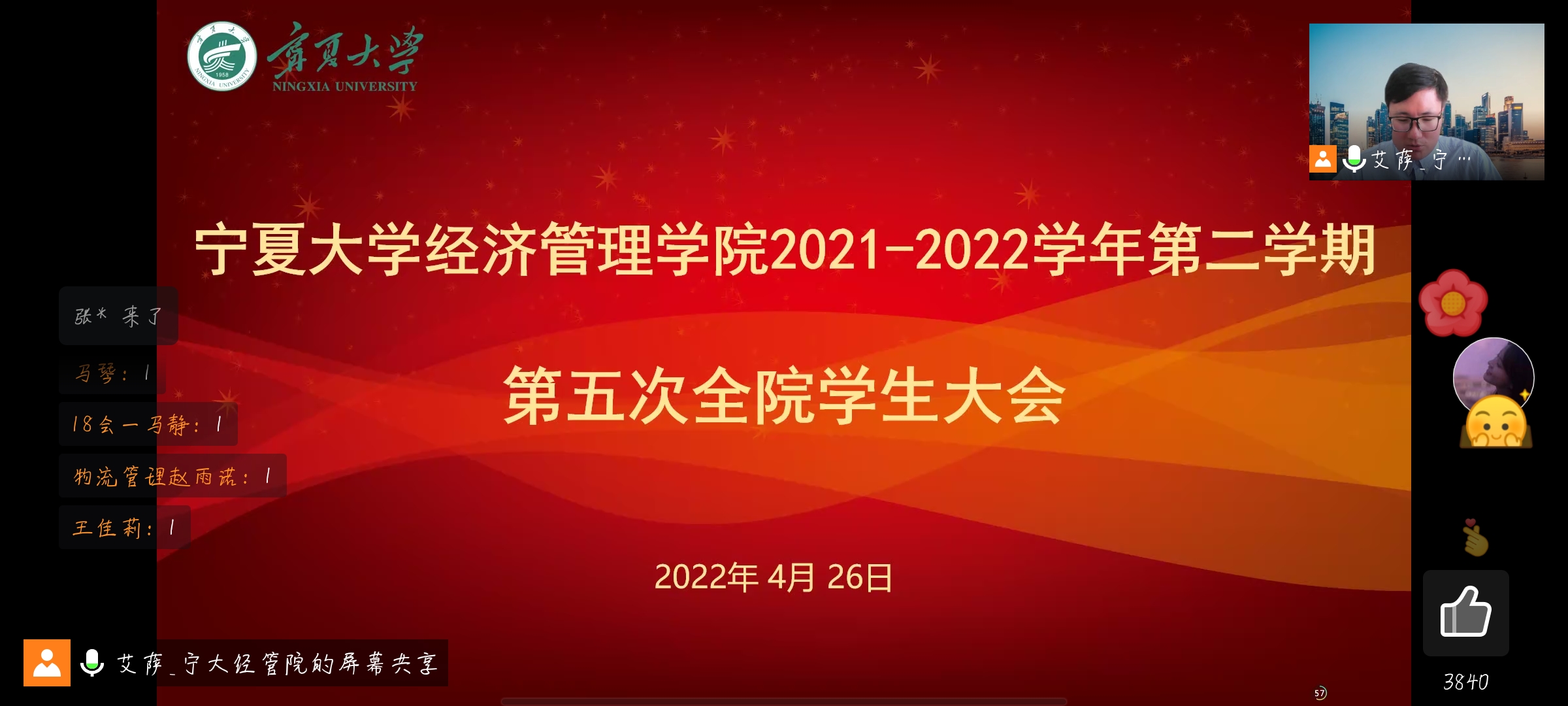 4月26日晚,beat365在线官网入口在线上举行了2021—2022年度第二学期第五次年级大会,公司党委副书记马建宏、常江,教学科研办公室副主任梁非凡,党建秘书姚硕,员工工作办公室辅导员艾萨•阿尤普、孙文元、禹文杰,李立朋、李杨等教师,公司全体本科生、研究生参加会议。会议由艾萨主持。
