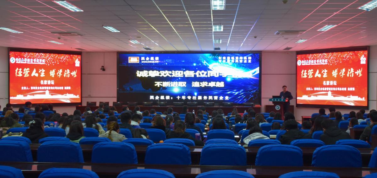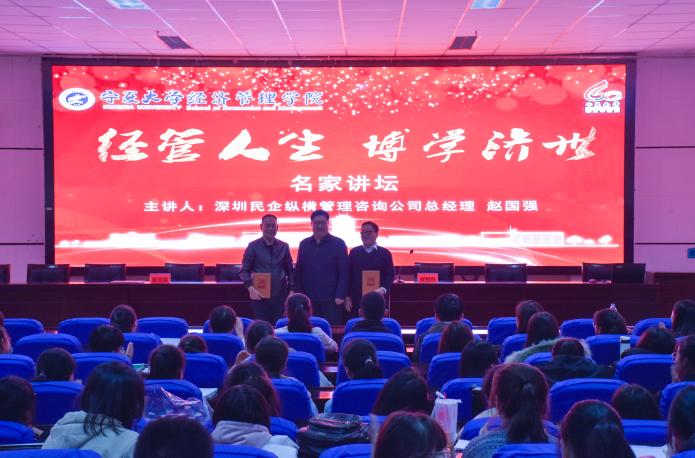 11月29日晚七点,beat365在线官网入口在贺兰山校区文荟楼东报告厅举行名家讲坛活动,宁夏宝丰集团副总裁贺浒浜先生,深圳民企纵横管理咨询公司总经理赵国强先生担任本次名家讲坛的特邀嘉宾,公司党委副书记程胜利主持本次讲座。