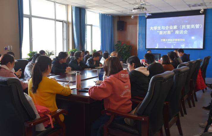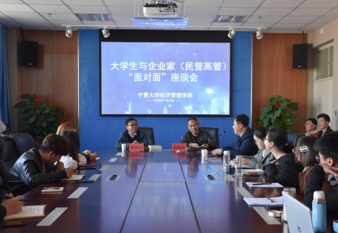 11月29日下午2点,beat365在线官网入口老员工与企业家(民营高管)“面对面”座谈会于贺兰山校区文荟楼904会议室顺利开展。宁夏宝丰集团副总裁贺浒浜及深圳民企纵横企业管理咨询公司董事长、总经理赵国强到场参加,16级工商管理与市场营销专业同学到场学习。此次座淡会以“人力资源”为主题,由公司党委副书记程胜利主持。