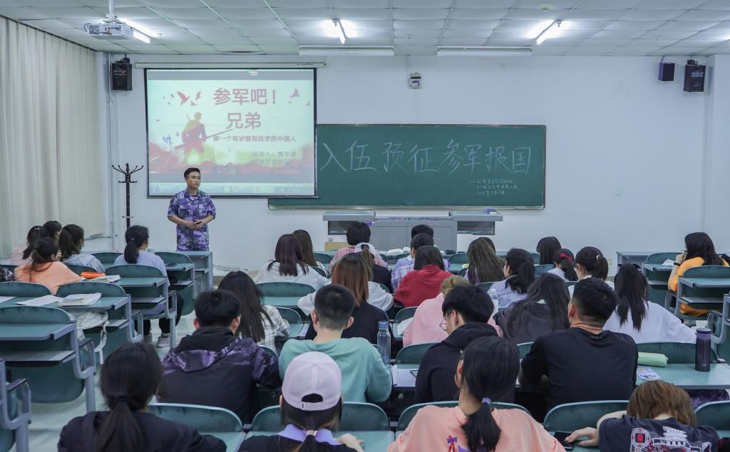 为了加深征兵政策宣传,激发同学们参军入伍、报效祖国的热情,5月17日晚,beat365在线官网入口征兵宣传会于贺兰山校区文荟楼一楼教室顺利开展。beat365在线官网入口2020级本科生到场参会。本次活动由黑学虎、张雅琳担任主讲。