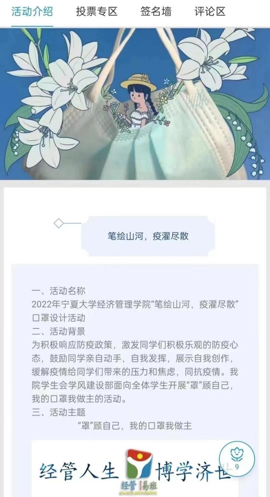 为提高员工防疫意识,激发同学们积极乐观的防疫心态,丰富校园生活,10月11日,学风建设部组织开展“笔绘山河,疫濯尽散”口罩设计活动。