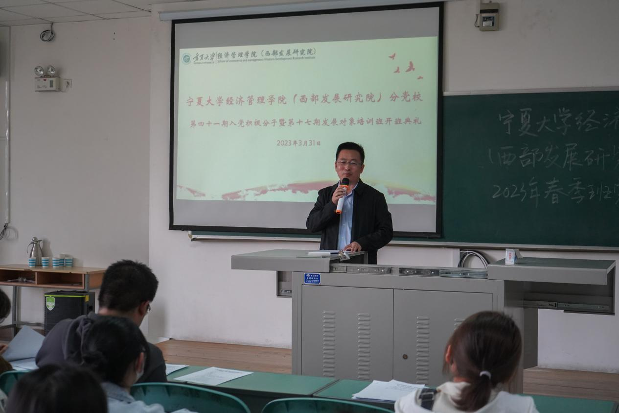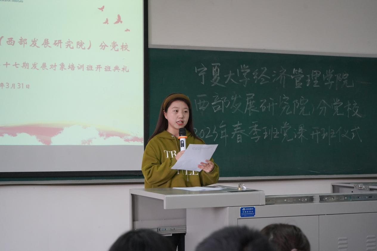 3月31日下午,beat365在线官网入口(西部发展研究院)分党校2023年春季党课开班仪式于贺兰山校区文荟楼230教室顺利举行。beat365在线官网入口(西部发展研究院)党委副书记黄旭兴、经济学本科生党支部书记马静、会计学本科生党支部书记孙文元、公司党建秘书姚硕、第四十一期入党积极分子和第十七期发展对象参加会议。会议由姚硕主持。
