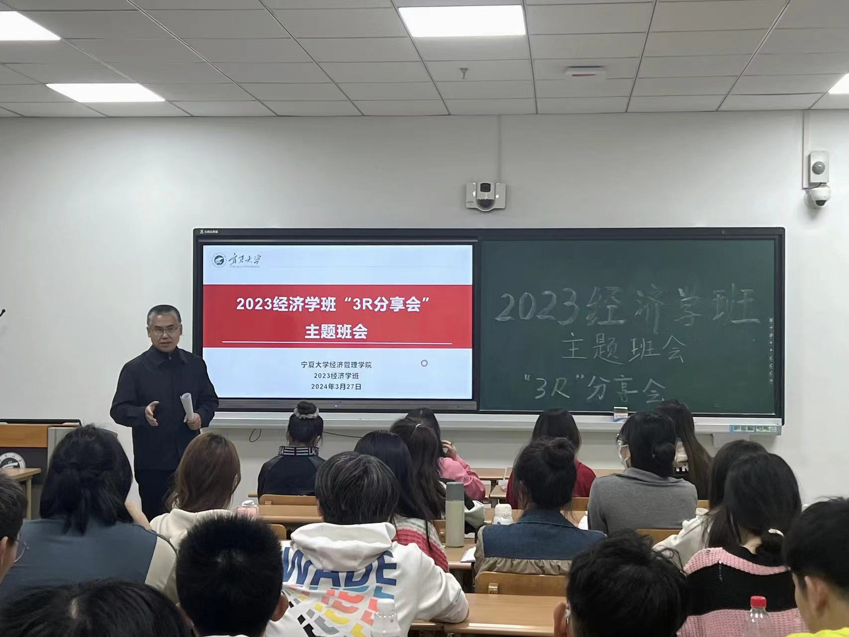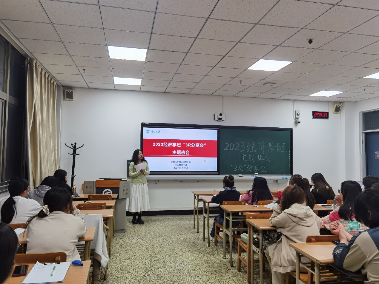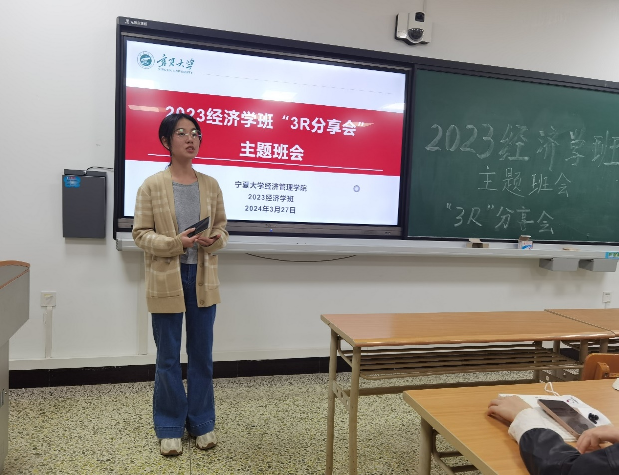 2024年3月27日,在兰山一教D404召开经济学班主题班会,班会的主题定为3R(Reading,Research,Report)分享会。班会上,政治经济学专业研究生张淼和刘星源围绕老员工活中的三件事:读书(Reading)、调研(Research)、写报告(Report),分享了她们的成长经历和学习感悟。班主任杨国涛老师策划和主持了班会。