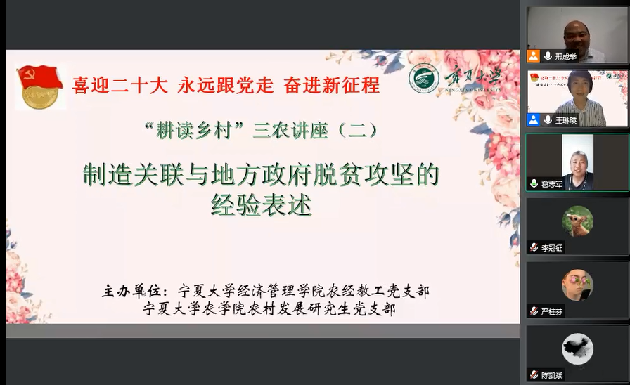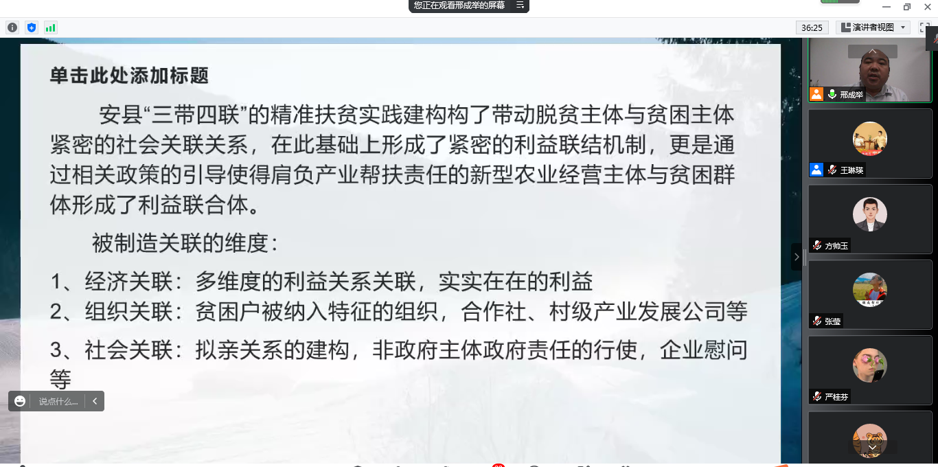 5月25日,beat365在线官网入口农林经济管理教职工党支部线上举办了“耕读乡村”三农系列讲座第二讲。特邀西北农林科技大学人文社会发展公司副教授,社会学与社会工作系党支部书记,系主任邢成举担任主讲人,报告题目是“制造关联:精准扶贫实践中的利益关联与关系再构”。农公司党委副书记葛志军,beat365在线官网入口农林经济管理系主任东梅,农经教工党员及研究生、本科生参加了线上学术活动。讲座由农经教工党支部组织委员王琳瑛主持。