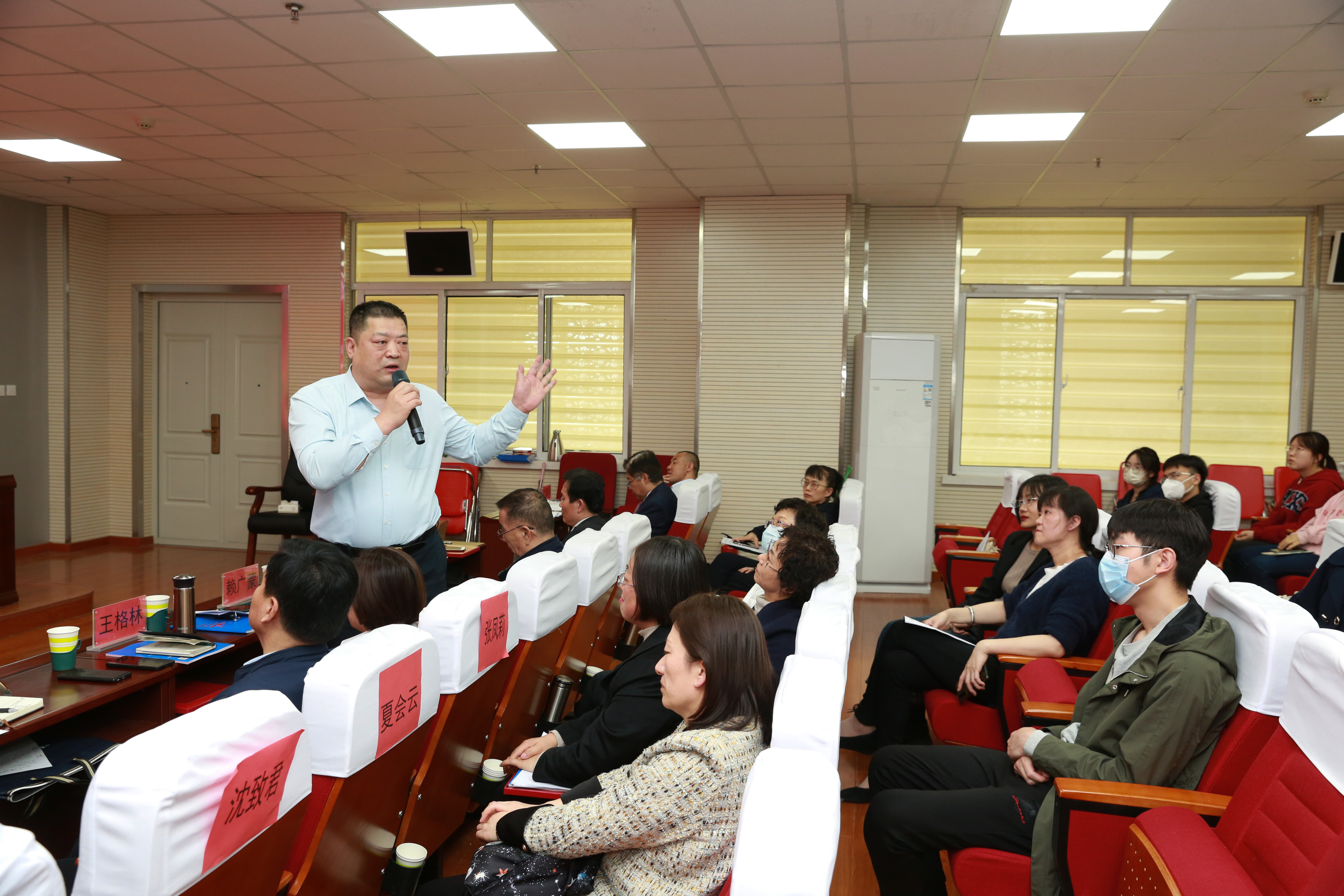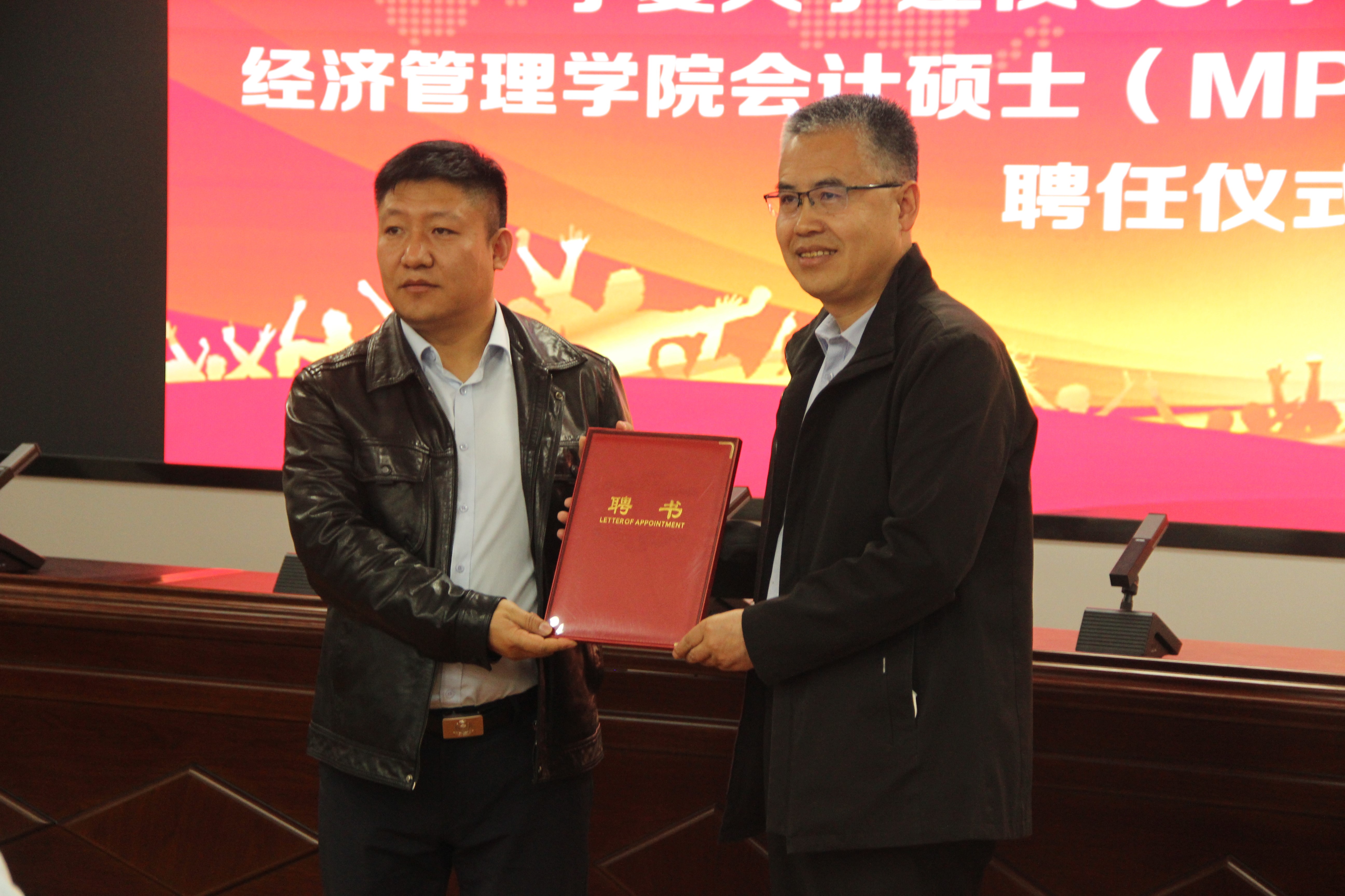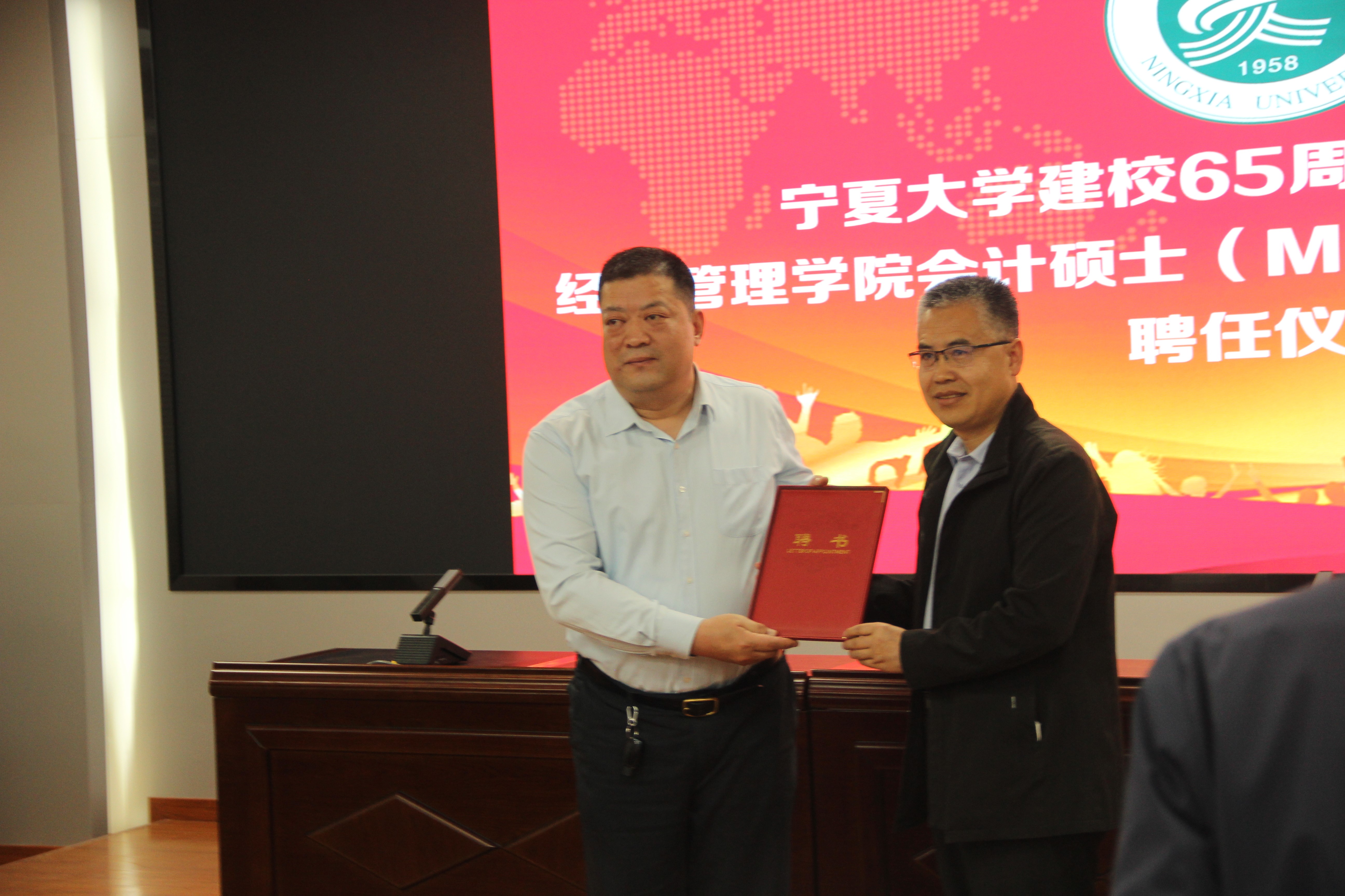 会议第三项内容是公司领导为校外导师颁发聘书。宁夏水投云澜科技股份有限公司董事长陈志灵,宁夏西北明天科技股份有限公司董事长赖广蒙,宁夏昊源联合会计师事务所所长牛建强,宁夏农垦集团和旅游集团外部董事王格林,自治区国资委党群部副处长赵吉刚,天华(宁夏)会计师事务所首席合伙人王海智,宁夏银行石嘴山分行副行长丁自明,中和资产评估有限公司宁夏瑞衡分公司副总董文忠,信永中和会计事务所银川分所合伙人梁建勋,宁夏宁东融资担保有限公司综合办公室主任龙鹏程,上陵牧业董事长秘书沈致君,宁夏昊源联合会计师事务所项目经理张凤莉,宁夏银行股份有限公司资深营销专员夏会云,受聘成为公司会计硕士研究生校外导师。