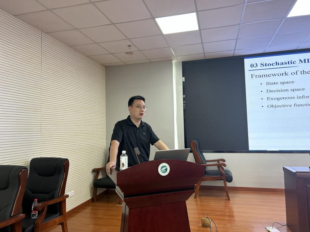 电子科技大学经济与管理公司晏鹏宇教授汇报题目为《An Online RL Approach to Charging and Order-Dispatching Optimization for an E-hailing Electric Vehicle Fleet》。他的研究尝试解决随机订单下网约车平台上电动汽车的最佳充电和订单调度问题,提出了一种在线Sarsa(∆)-SAA算法,以最大限度地提高平台的收益。