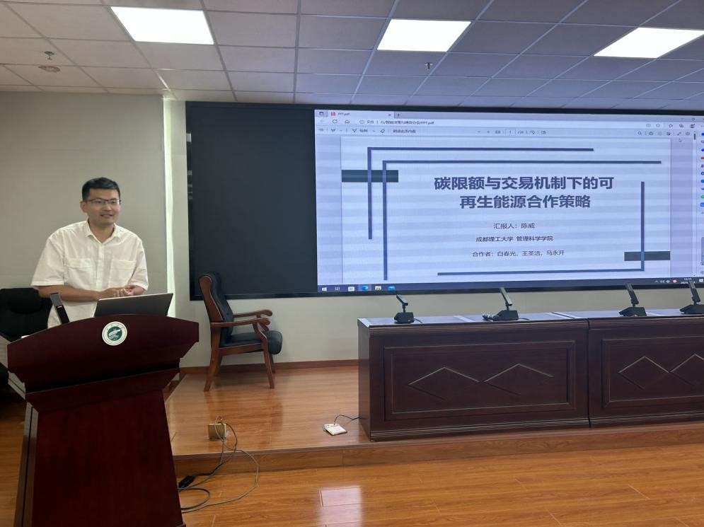 成都理工大学管理科学公司陈威研究员汇报题目为《碳限额与交易机制下的可再生能源合作策略》。他考虑了无合作、半合作和完全合作三种投资合作模式对供应链企业关键投资决策的影响,发现完全合作情形的发电商可再生能源投资量大于半合作情形下和无合作情形下,无合作情形下的售电商可再生能源投资量大于半合作情形下和完全合作情形下,且供应链整体的可再生能源投资量受可再生能源投资成本系数的影响。