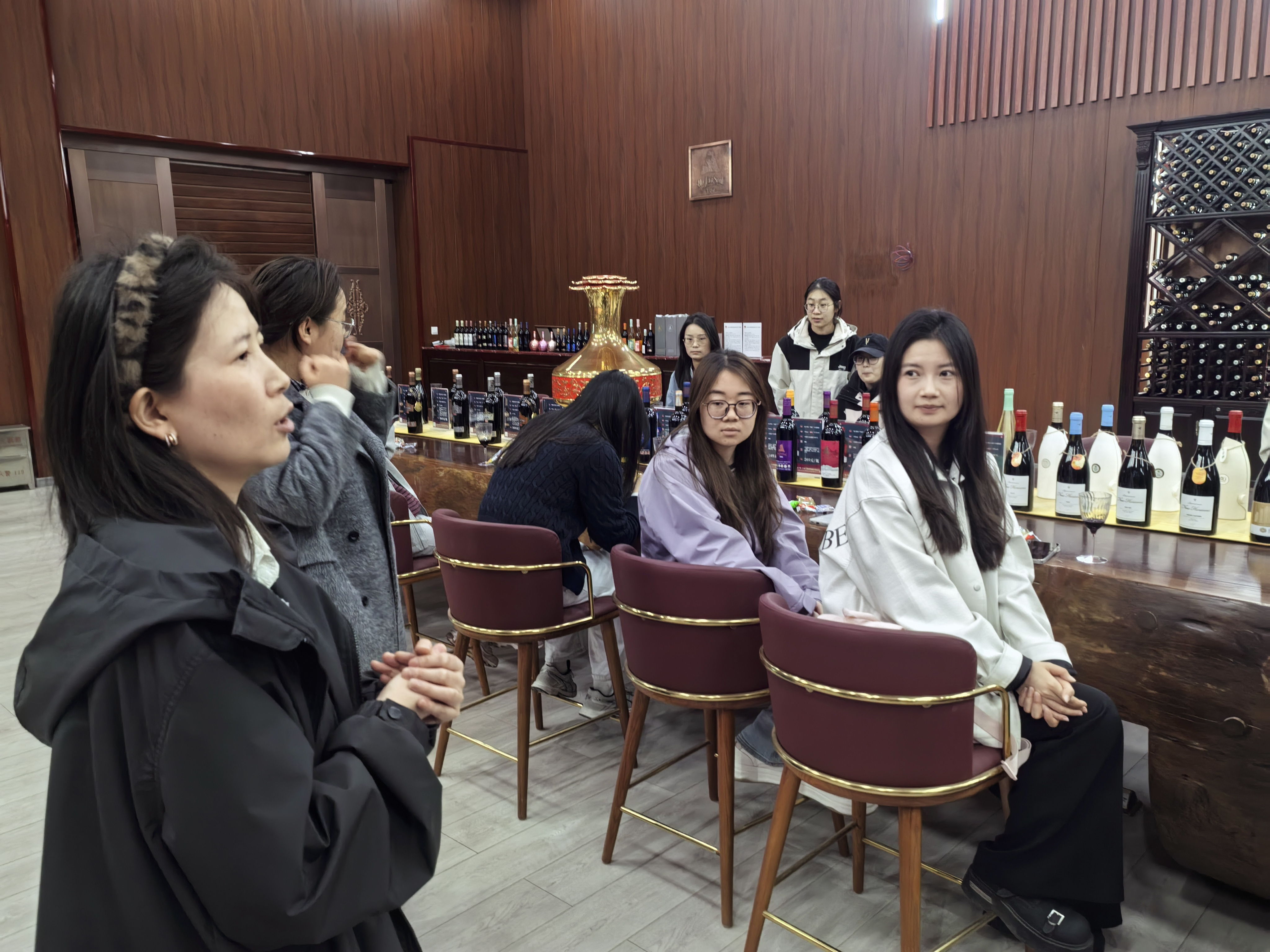 师生一行首先走进宁夏米擒酒庄,开启沉浸式产业研学。该酒庄是由澳海集团控股,西夏风情园独资投资建设,以西夏古国八大党项部落之一的米擒氏命名,取其性豪爽,喜饮酒,善酿酒。在专业讲解员的带领下,大家依次参观葡萄破碎压榨车间、低温发酵车间、橡木桶陈酿区与全自动灌装生产线,近距离观摩从原料筛选、控温发酵到橡木桶陈酿、无菌灌装的全流程酿造工艺,细致了解各工艺环节对葡萄酒风味与品质的影响。在酒庄文化展厅,师生们系统学习了贺兰山东麓百万亩葡萄长廊的发展历程、产区独特的风土优势,以及米擒酒庄扎根宁夏、深耕葡萄酒产业的品牌故事。专业品鉴环节中,酒庄品酒师现场传授葡萄酒品鉴的基本方法、礼仪规范与风味辨识技巧,引导同学们通过观色、闻香、品味,直观感受不同年份、不同品种葡萄酒的独特魅力。在交流互动的过程中,同学们踊跃提问,企业负责人逐一耐心解答,提升了大家对宁夏“紫色名片”的认知层次,为今后选择在该领域就业提振信心,有效纠正了“慢就业”“懒就业”等倾向。