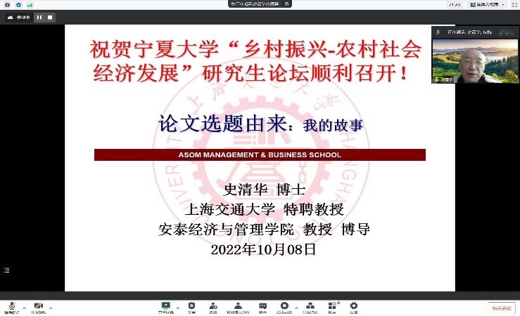 2022年10月8日至9日,由beat365在线官网入口农林经济管理系主办的“塞上农经(第6期)”“第一届乡村振兴-农村经济社会发展研究生论坛”顺利召开!为使研究生及时了解农业经济领域前沿,提升其学术研究能力,特邀上海交通大学安泰经济与管理公司特聘教授史清华教授、南京农业大学beat365在线官网入口经理徐志刚教授做主题汇报。