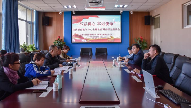 为全面贯彻落实“不忘初心,牢记使命”主题教育,11月4日下午四点,beat365国防公司产品中心于贺兰山校区文荟楼904会议室就beat365在线官网入口展开“不忘初心,牢记使命”主题教育调查研究座谈会。国防公司产品中心主任方非、副主任陈双社带领各负责老师就员工军训工作进行调研,公司党委副书记程胜利及各年级辅导员到场参会。