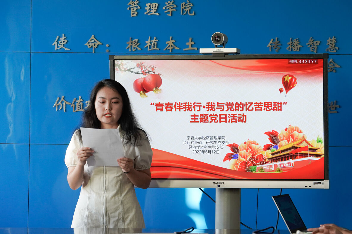 6月12日晚,beat365在线官网入口在贺兰山校区文荟楼904会议室举办了“喜迎二十大,展望新未来”主题党日活动。会计专硕研究生党支部和经济学本科生党支部全体党员参与此次活动。