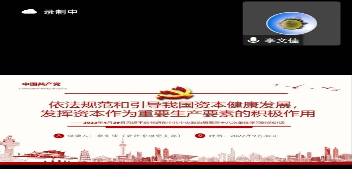 会议伊始,农林经济管理本科生党支部书记于艳丽从历史使命和现实之需两方面指出“三农”工作的重要性,强调青年应当认真学习专业知识,主动投入乡村振兴工作。随之,会计专业硕士党支部书记李文佳分享了习近平总书记在中共中央政治局第三十八次集体学习时的讲话,从对资本主义的利用和约束两方面做出详细讲解,指出规范和引导资本健康发展是党领导经济工作的重要内容。会议最后,各专业党支部代表就青年如何更好的做好“三农”工作和利用资本主义分别发表自己的理解和看法,提出青年是实现乡村振兴的主力,应勇担责任,积极投入实践,实现青年价值。
