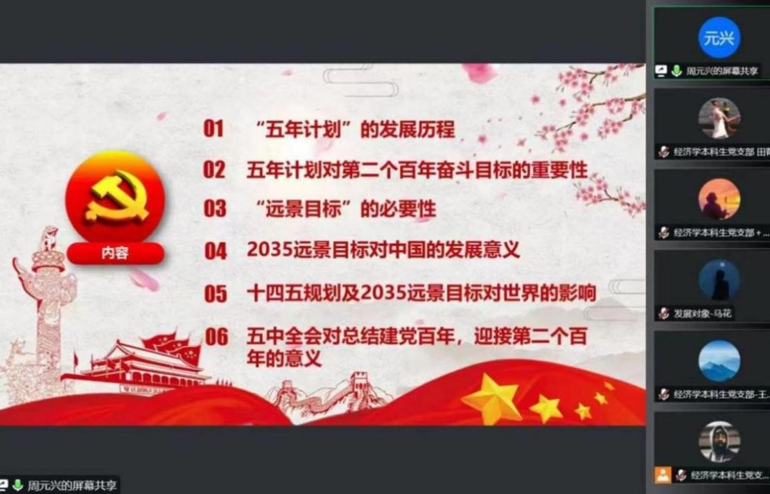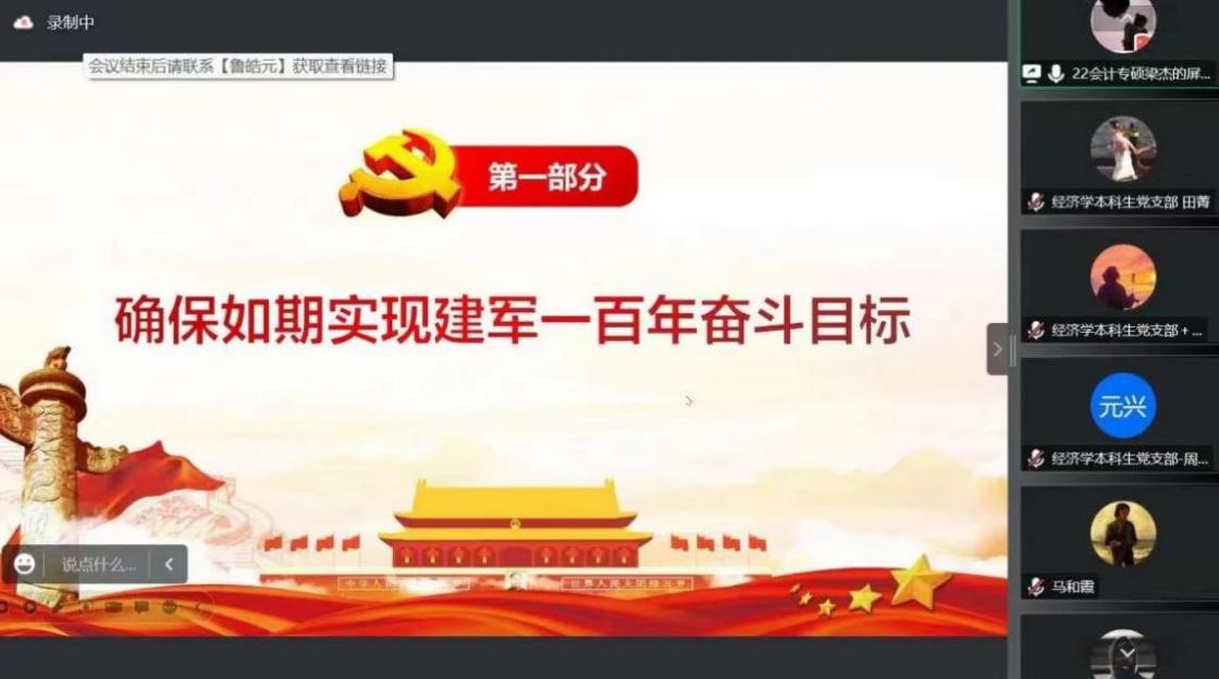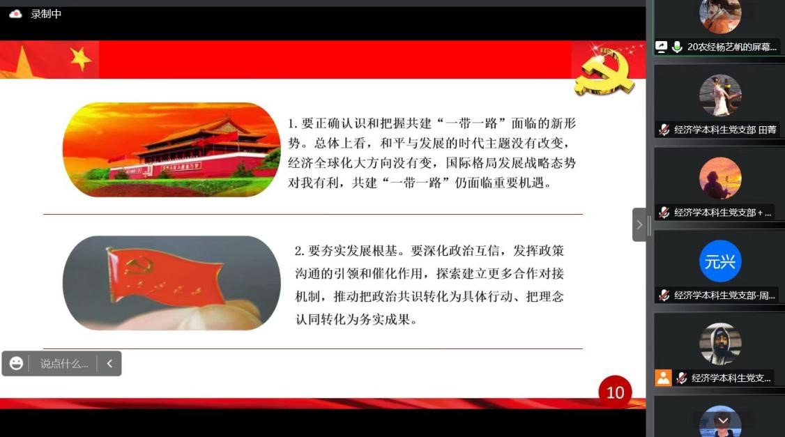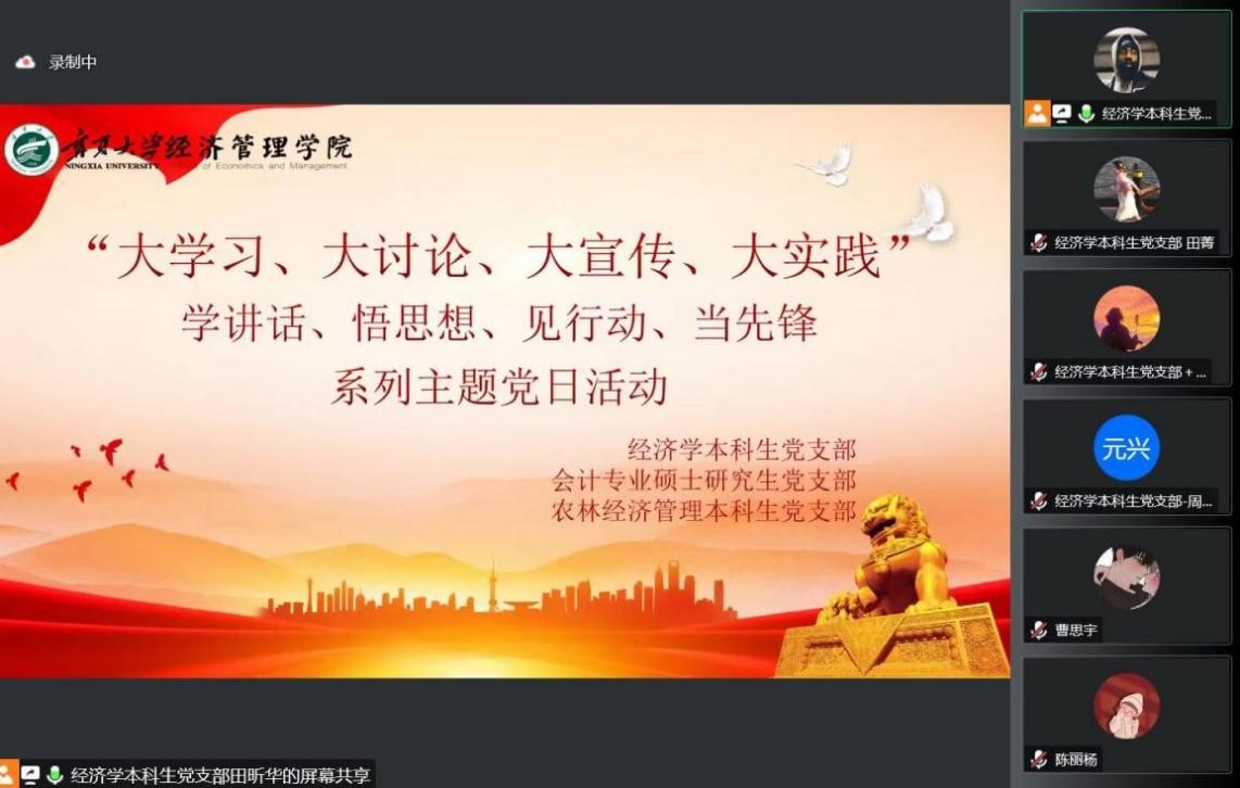 10月14日晚,beat365在线官网入口“大学习、大讨论、大宣传、大实践;学讲话、悟思想、见行动、当先锋”系列主题党日活动第四讲于线上顺利举行。经济学本科生党支部、会计专业硕士研究生党支部及农林经济管理本科生党支部参加本次会议。会议由田昕华主持。