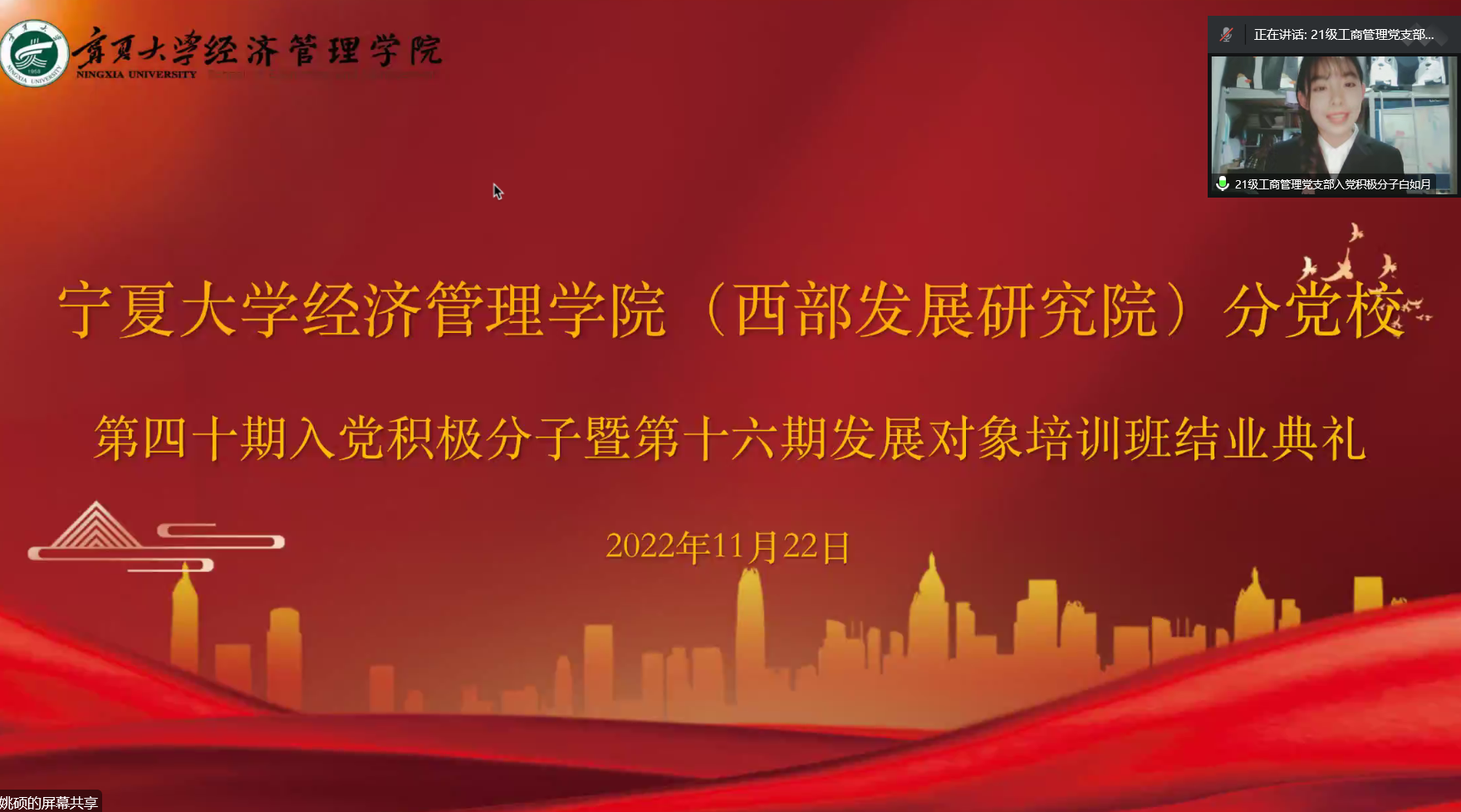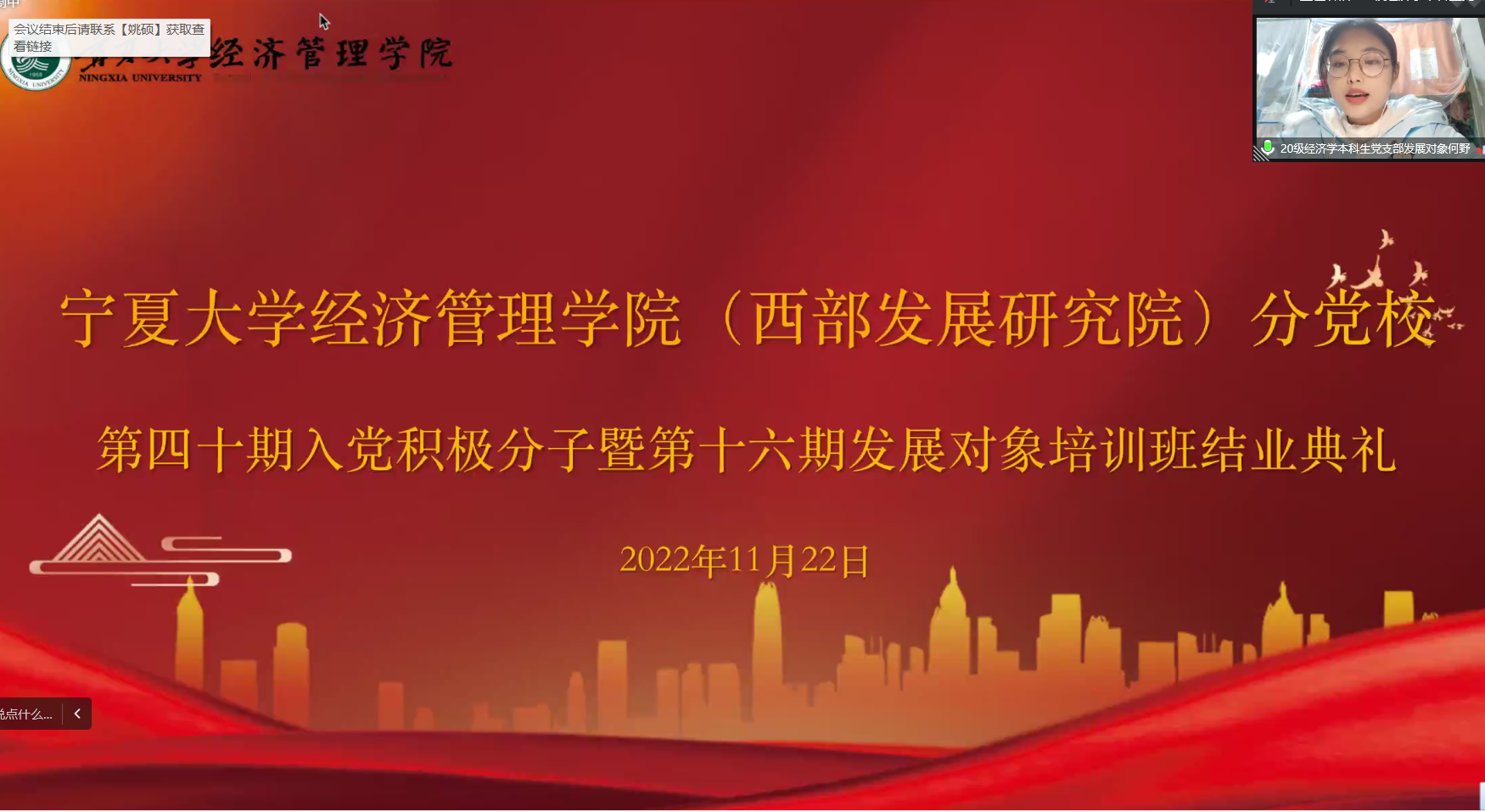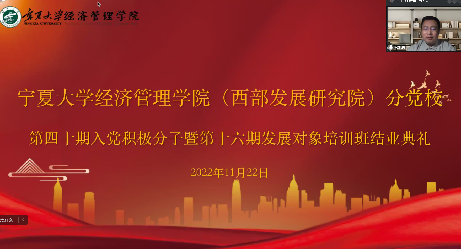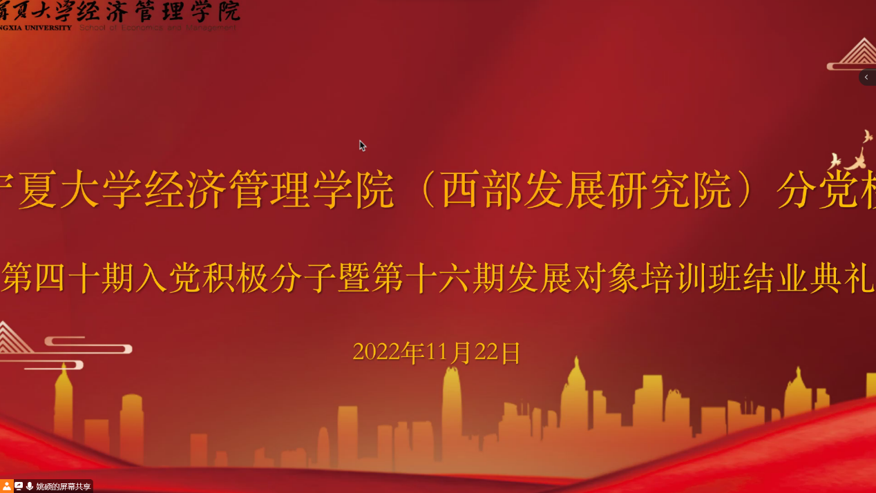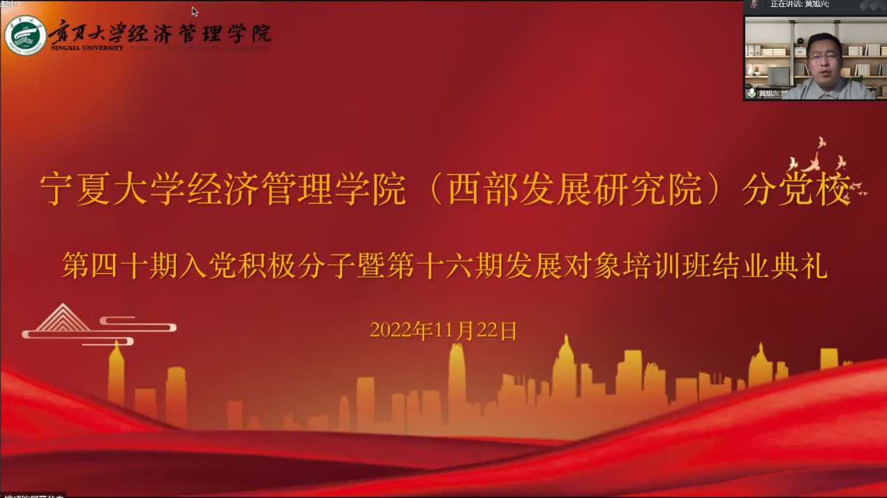 11月22日下午,beat365在线官网入口(西部发展研究院)分党校第四十期入党积极分子暨第十六期发展对象结业典礼在线上顺利举行。公司党委副书记黄旭兴、党建秘书姚硕、第四十期入党积极分子和第十六期发展对象参加了会议。会议由姚硕主持。