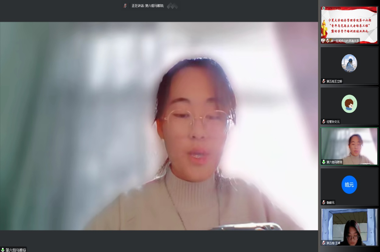 结业典礼在奏唱共青团团歌中拉开了序幕。鲁皓元宣读了优秀小组及优秀学员名单。优秀学员马雅琼进行发言,她号召同学们加强政治理论学习,用理论指导实践,坚定理想信念,为民族复兴、社会主义现代化贡献自己的青春力量。
