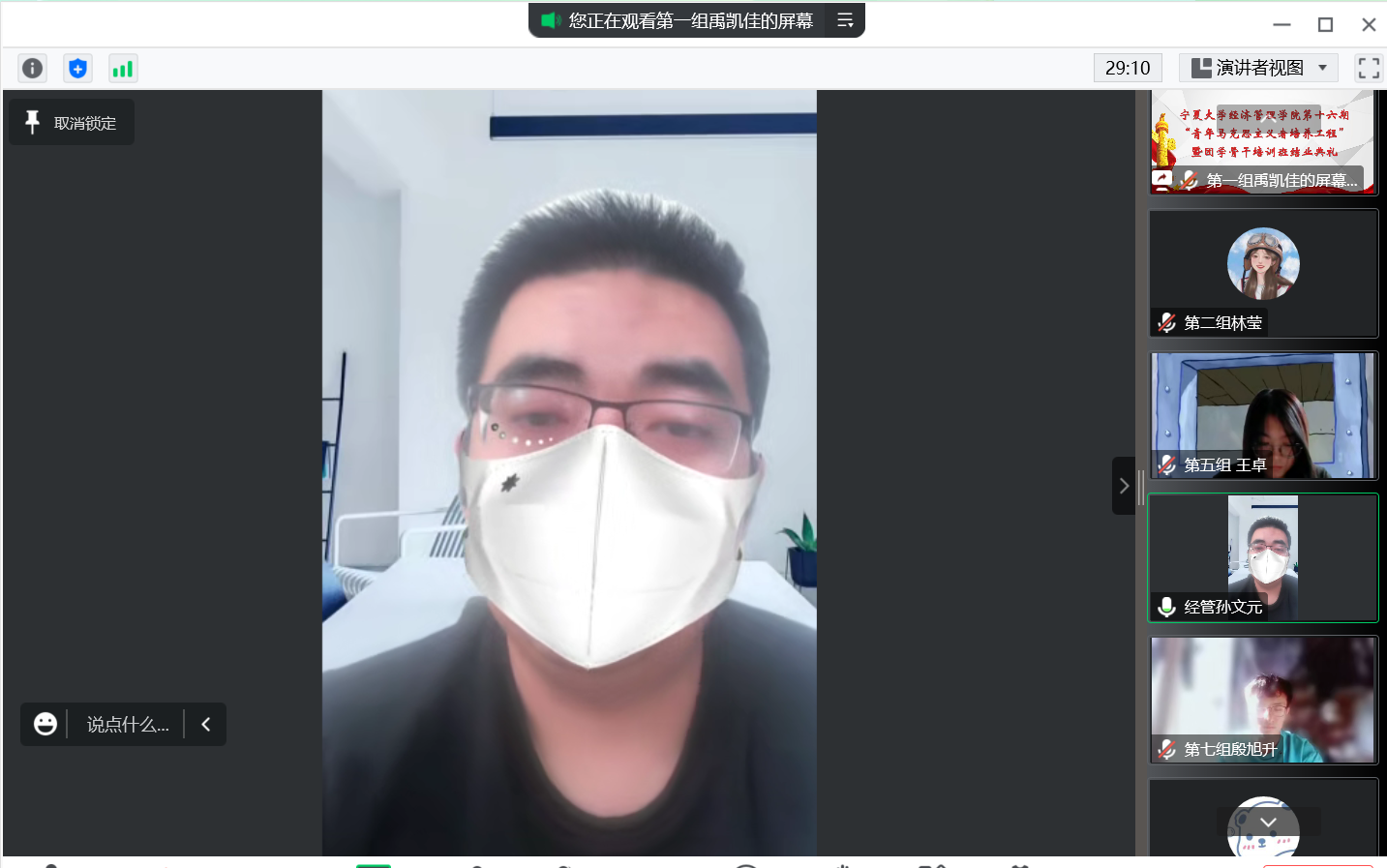 孙文元总结发言,他表示青马班学员要发挥示范引领作用,积极配合公司的疫情防控工作,了解同学们的所思所想并及时反馈。同时,他希望学员在社会实践、服务同学、学习生活上严格要求自己,勤学习、立远志、重实干,将好的状态坚持到底,并迎难而上,锤炼本领,磨炼意志,成为德智体美劳全面发展的社会主义合格建设者和可靠接班人。