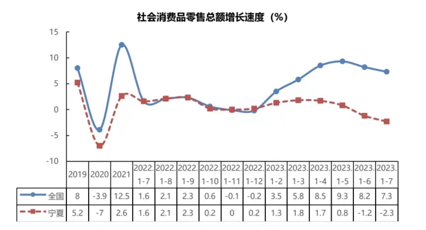2023年1-7月份,全区实现社会消费品零售总额751.04亿元,同比下降2.3%,比2022年同期下降3.9%,比全国低9.6%,较2019年下降7.5%,四年平均下降1.86%。全区消费 品市场运行呈现一季度保持较高增速,二季度开始增速回落,从7月份开始,降幅有所收敛。